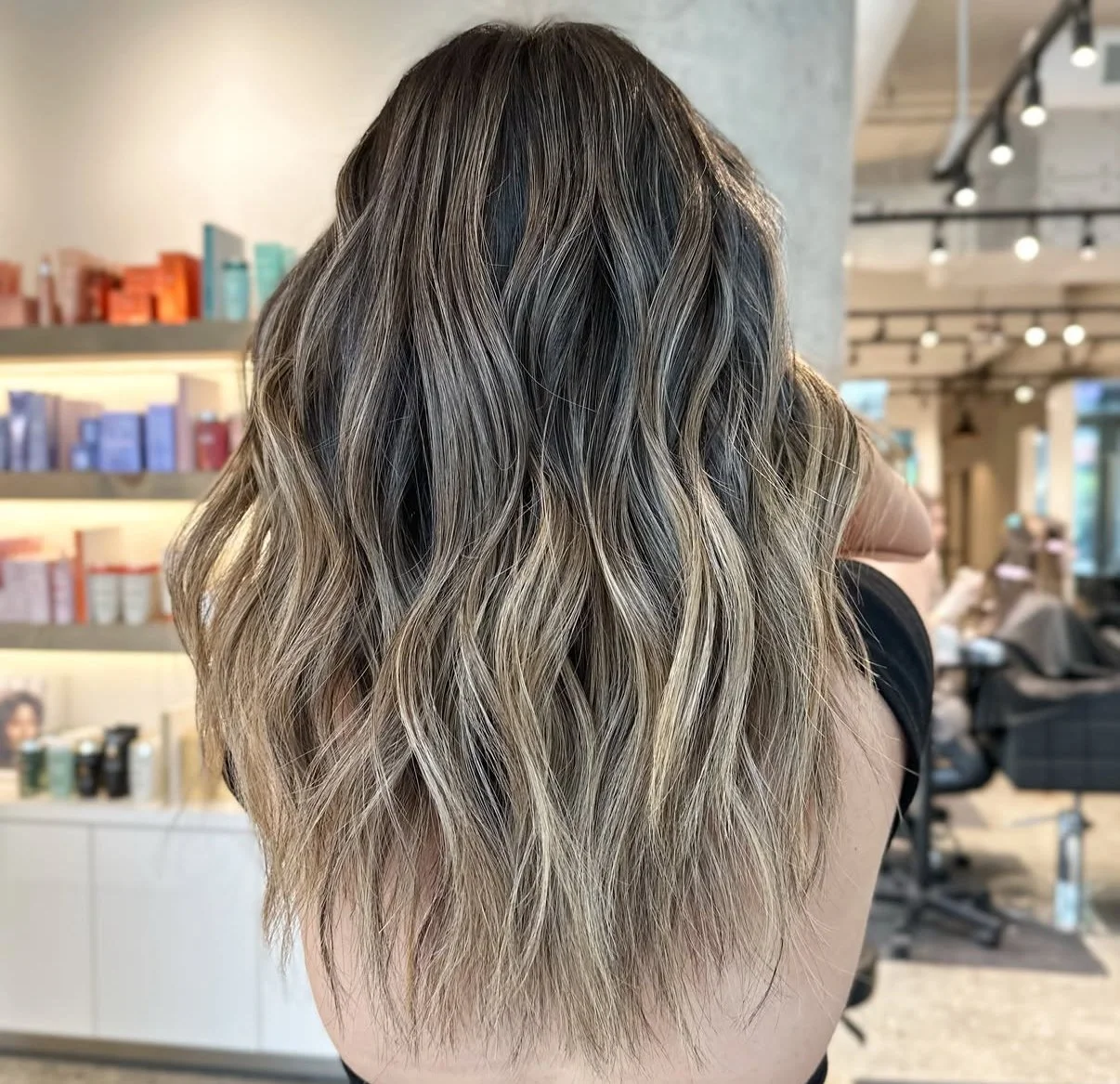 This look involves heavier lightening through the bottom of the hair, creating a more solid, bright result. It uses more foils than a dimensional balayage and requires additional time and processing. This service is typically booked with our senior stylists.If you’re looking for a platinum balayage, please select the “Platinum” modifier when booking, as it requires extra processing and bleaching.